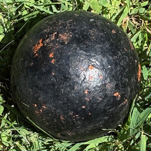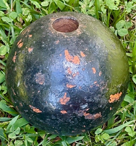 12pdr spherical shell in nice condition. This type took the wood fuse adapter and was used by both sides. It is not a polygonal cavity shell.