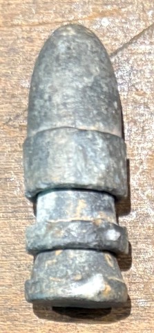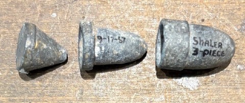 Shaler 3pc sectional bullet in the long pattern with the thick belt around the nose section. Recovered on September 17, 1967 probably by Mac Mason or one of his friends. This came off a relic board of mostly Mac Mason-marked bullets and the date writing on the middle section may be in his hand, but I do not think the writing on the nose section is.