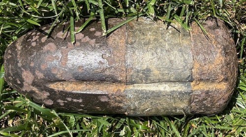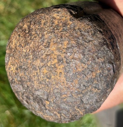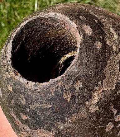Nice 3in Hotchkiss shell that is uncommon because this one was made to take a wood time fuse adapter, not a threaded metal one. This is a hard shell to get.