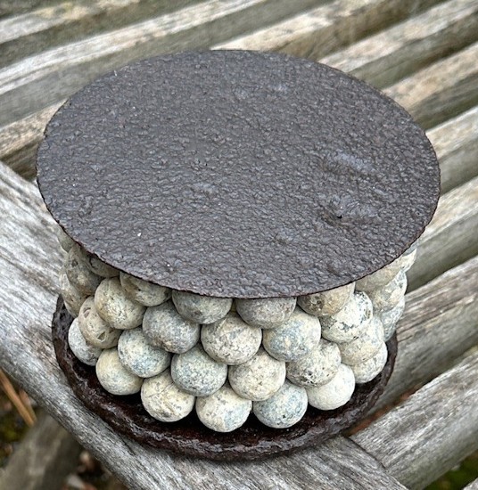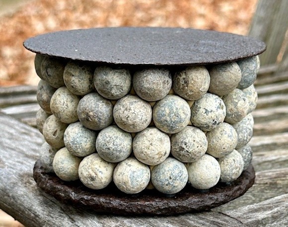 12pdr canister faithfully reconstructed to the specs for a Mountain Howitzer. Award winning canister guru Dave Gotter beautifully rebuilt this. Except for the top plate which may be a reproduction, all the other parts are original.