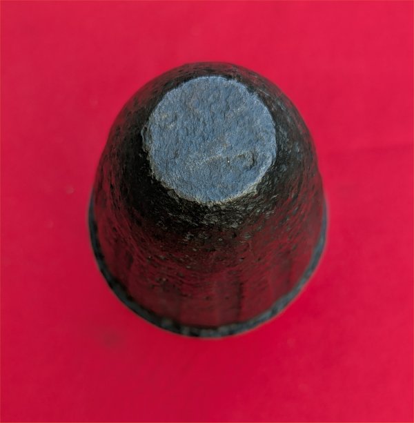This shell is the one on page 364 in Jack Bell's book on Heavy Artillery. The iron is in very good condition with only enough ground action to show it was dug. It has a very nice dated Schenkl percussion fuse that easily unscrews. The Schenkl patent information is clearly read on the face of the fuse. These football shaped Schenkl shells are very distinctive. If you like Schenkl shells, don't pass this one up!