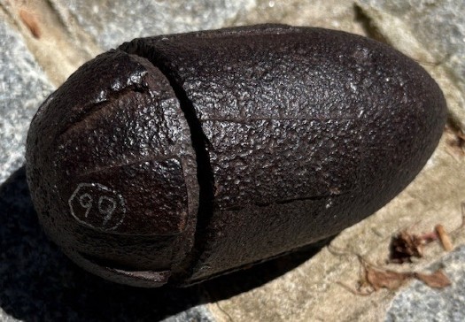 3.4in Dahlgren blind shell. These have a brass rivet in the nose and were filled with black sand, not powder. This one threw its sabot when it was fired.